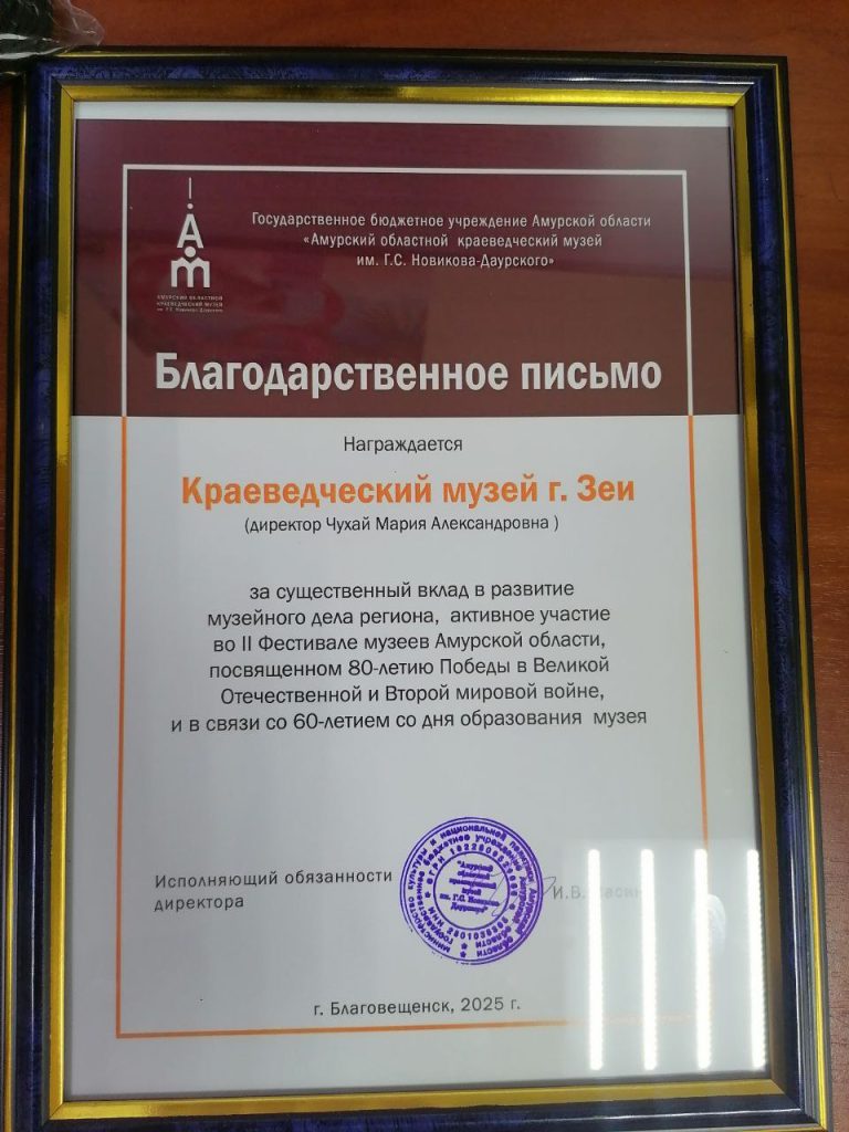 За существенный вклад в развитие музейного дела региона и активное участие во II Фестивале музеев Амурской области, посвященном 80-летию Победы директор музея Мария Чухай была отмечена благодарственным письмом Амурского областного краеведческого музея им. Г.С. Новикова-Даурского.