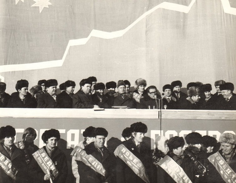 Победители соцсоревнования на митинге к пуску первого агрегата Зейской ГЭС, 27 ноября 1975 г.