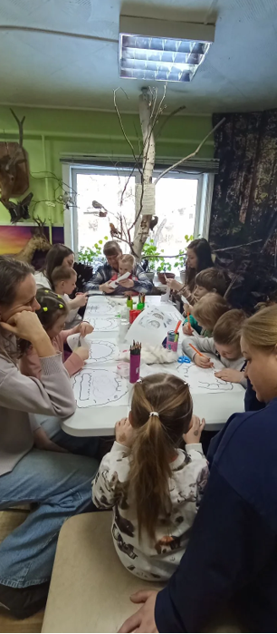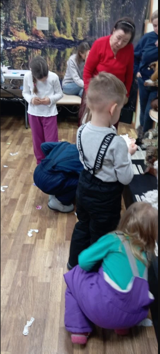 Дальше хозяйка тайги играла с детьми в познавательные игра. Все вместе делали гимнастику, раскрашивали следы зверьков, отгадывали, где чей хвост, а в завершении прошел мастер-класс «Норка для лисенка».