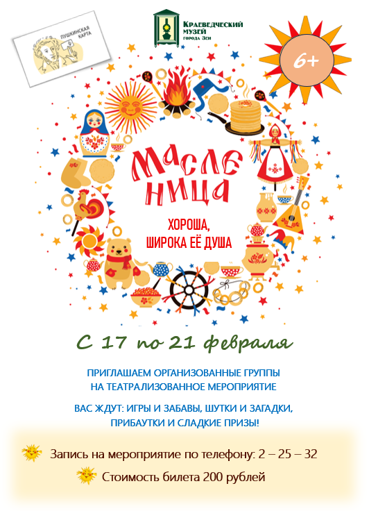 С 17 по 21 февраля Краеведческий музей приглашает принять участие в масленичной неделе «Масленица хороша, широка её душа».